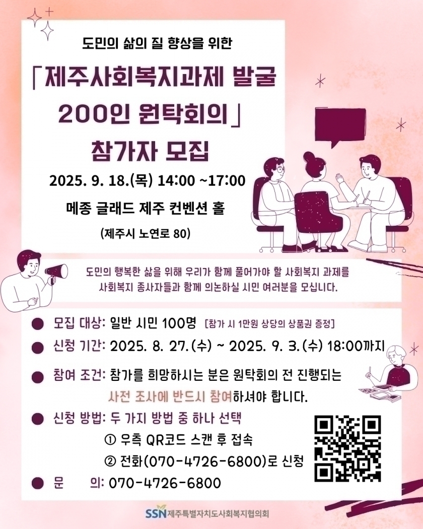⌈제주사회복지과제 발굴 200인 원탁회의⌋ 참가자 모집 안내![]() 제주사회복지협의회에서는 제주지역 사회복지 현안과 과제를 발굴하고 해결방안을 모색하기 위한 ⌈제주사회복지과제 발굴 200인 원탁회의⌋를 개최할 예정이오니 많은 관심과 참여 부탁드립니다 ○ 일시 : 2025. 9. 18.(목) 14:00~17:00 ○ 장소 : 메종 글래드 제주 컨벤션홀(제주시 노연로 80) ○ 모집 대상 : 일반 시민 100명(※참가 시 1만원 상당의 상품권 증정) ○ 신청 기간 : 2025. 8. 27.(수) ~ 2025. 9. 3.(수) 18:00까지 ○ 참여 조건 : 참가를 희망하시는 분은 원탁회의 전 진행되는 사전 조사에 반드시 참여하셔야 합니다. ○ 신청 방법 : 두 가지 방법 중 하나 선택 - 포스터 내 큐알코드 스캔 또는 네이버 폼 링크(https://naver.me/xJGizfdo)접속 후 신청 - 전화(070-4726-6800)로 신청 여러분의 많은 참여와 관심 부탁드립니다^^ |