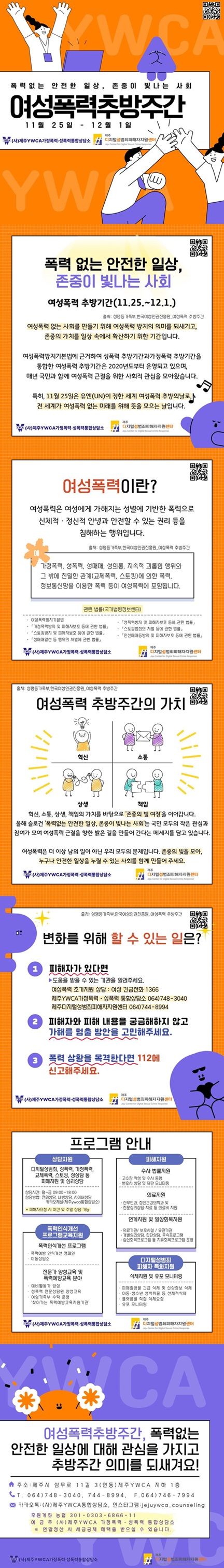 카드뉴스를 통해 (사)제주YWCA가정폭력ㆍ성폭력 통합상담소, 제주디지털성범죄피해자지원센터와 함께 여성폭력추방주간에 대해 자세히 알아볼까요?